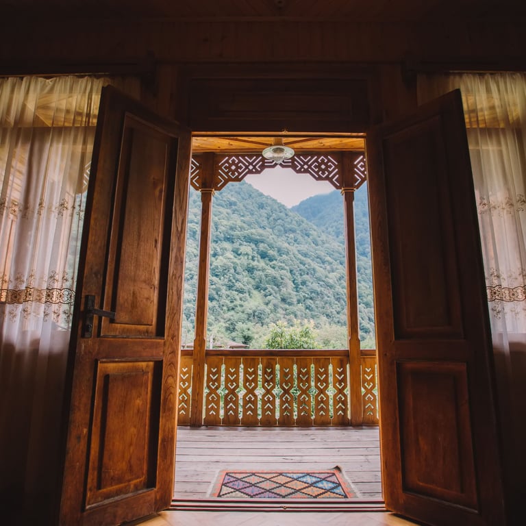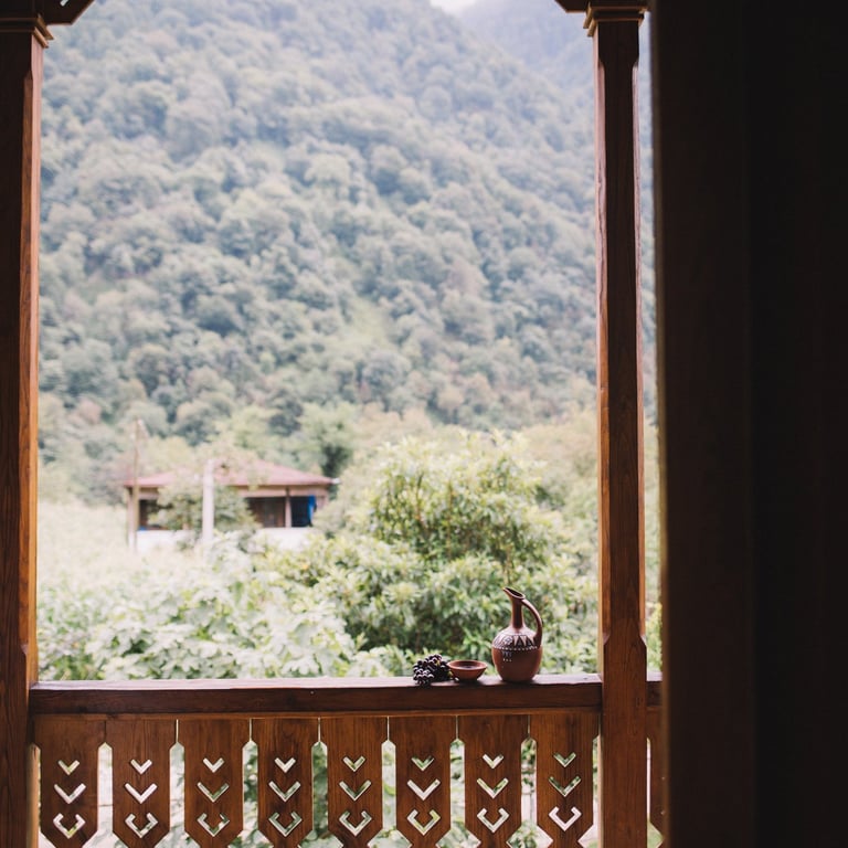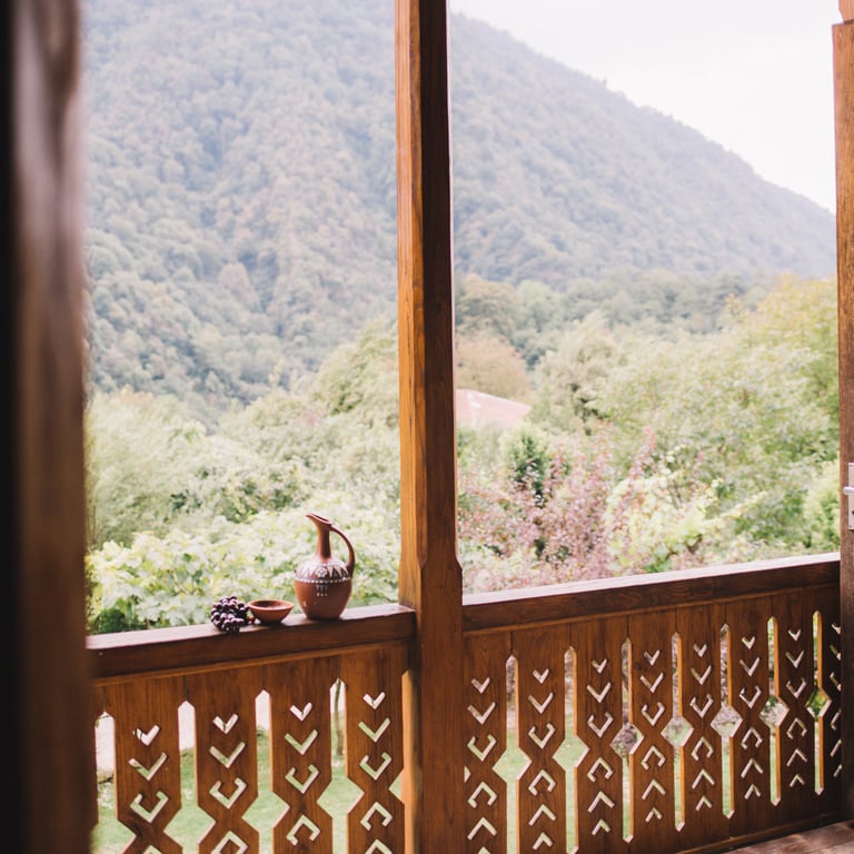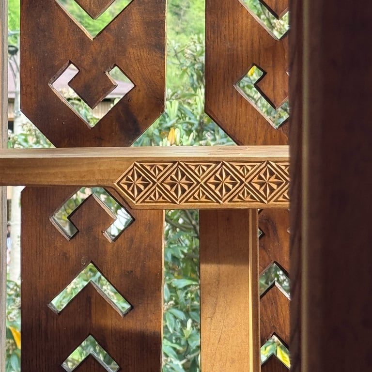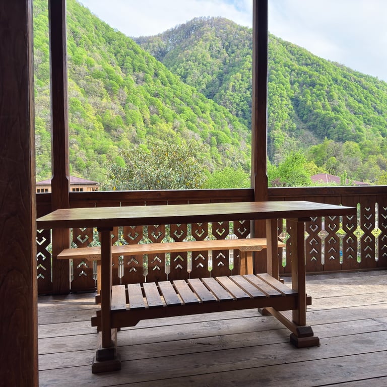 Crafted from rich chestnut wood, each baluster is meticulously hand-carved to blend traditional Lithuanian ornamental motifs with the timeless elegance of Georgian oda house architecture. A harmonious fusion of Baltic intricacy and Caucasian heritage—designed to grace your mountain terrace with warmth, history, and natural beauty.