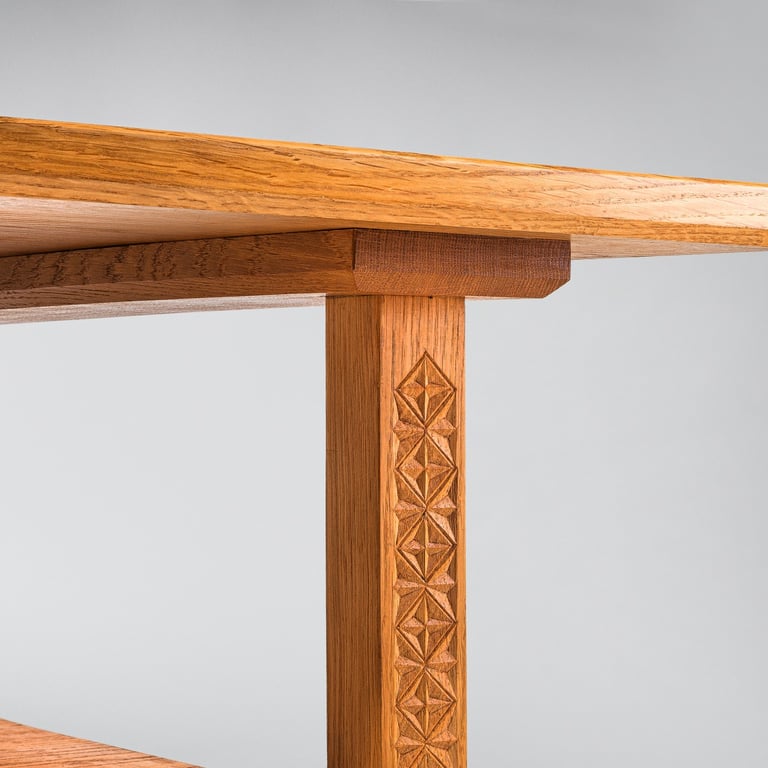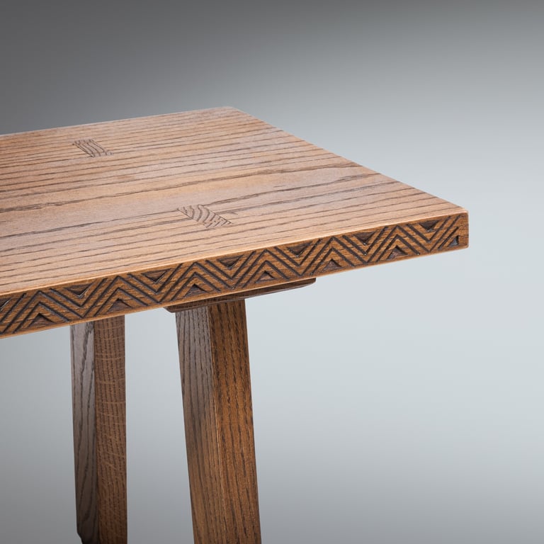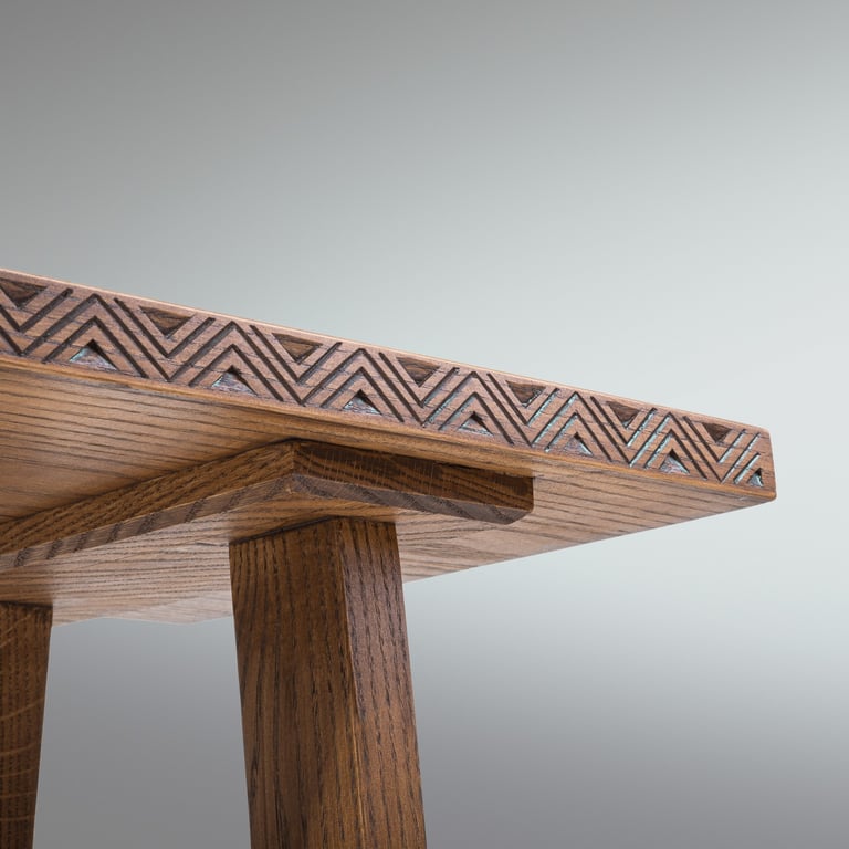 A solid oak coffee table featuring traditional Lithuanian folk carvings(raižiniai). The design draws from Baltic cultural motifs commonly found in traditional Lithuanian woodcraft. 112×70×45cm